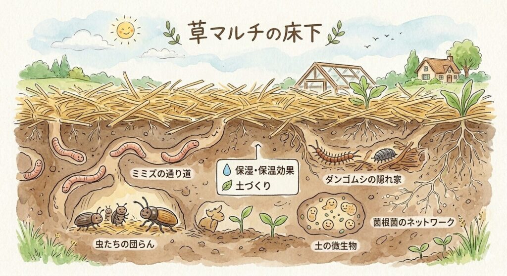 草マルチには、単なる「土覆い」を超えた多くの効果があります。