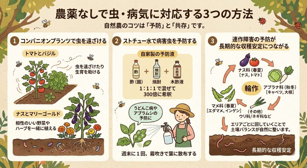 正直にお伝えすると、慣行農法に比べれば虫食いはあります。でも、壊滅することはほとんどないのが私の6年間の実感です。コツは「予防」と「共存」です。