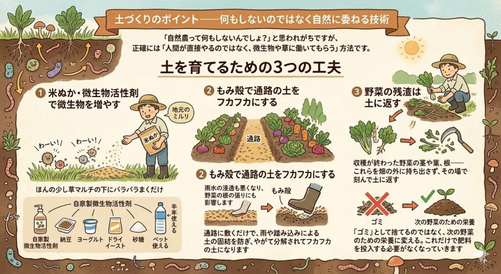 無肥料が基本の自然農でも、土の立ち上げ期には微生物を増やすひと工夫があると、野菜の生育が安定します。