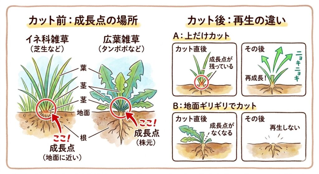 地際から刈ることで雑草の成長点を除去でき、刈られた草が再生しにくくなります。