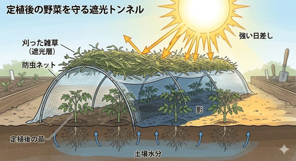 定植直後の苗は特に水やりを控え、直射日光が強い時期は「影」で苗を守りましょう。