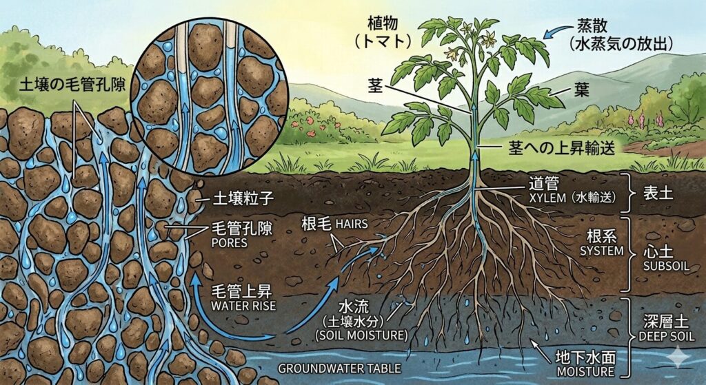 もう一つの力が、土壌が持つ「毛細管現象」です。